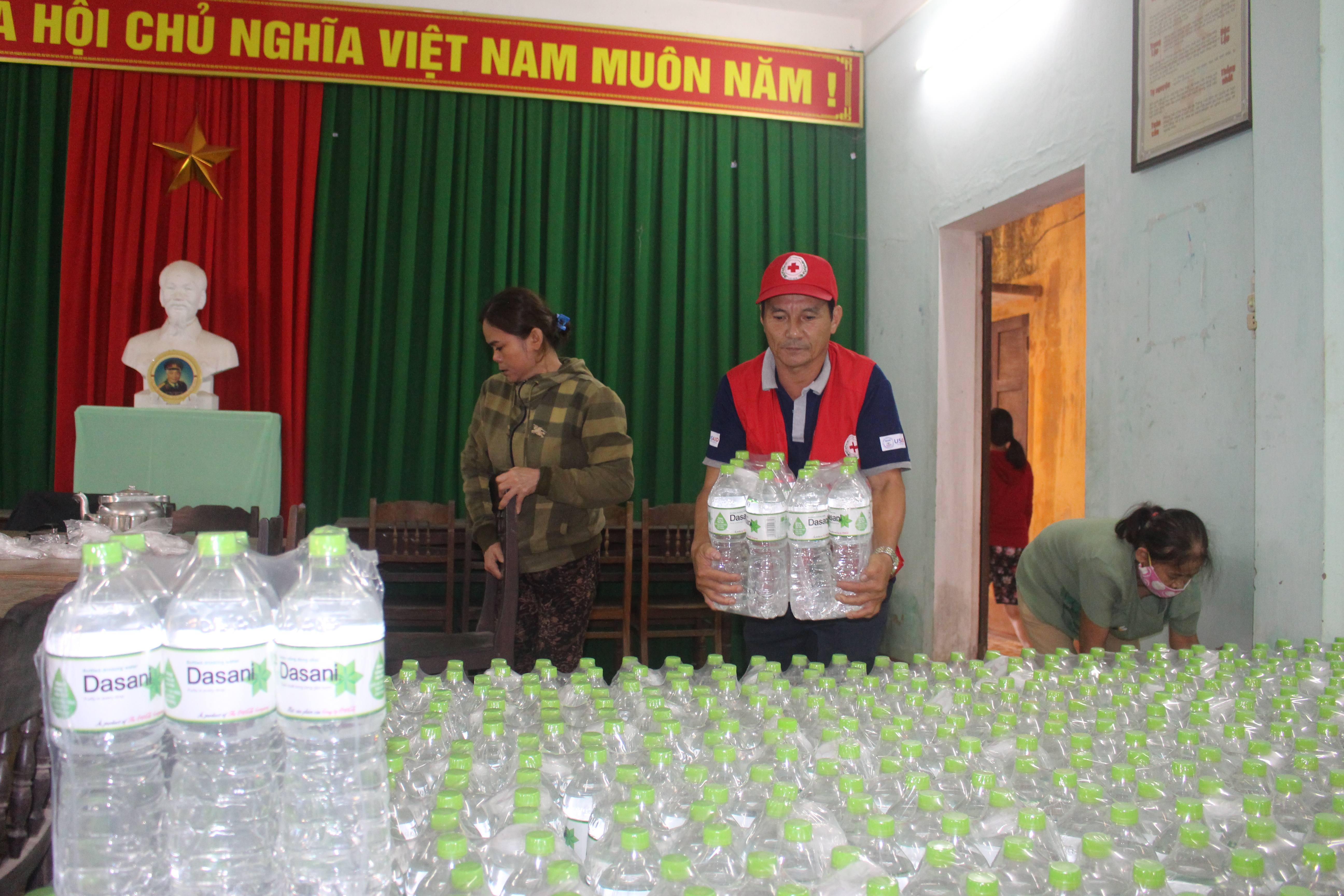 | Những chai nước sạch đang được chuyển đến tận tay người dân vùng lũ |