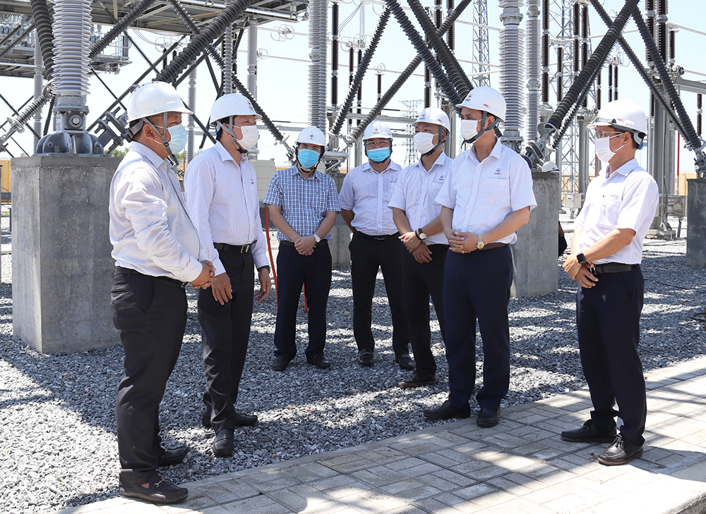 | Lãnh đạo EVNNPT và CPMB kiểm tra hiện trường tại TBA 500 kV Dốc Sỏi. Ảnh: EVNNPT |