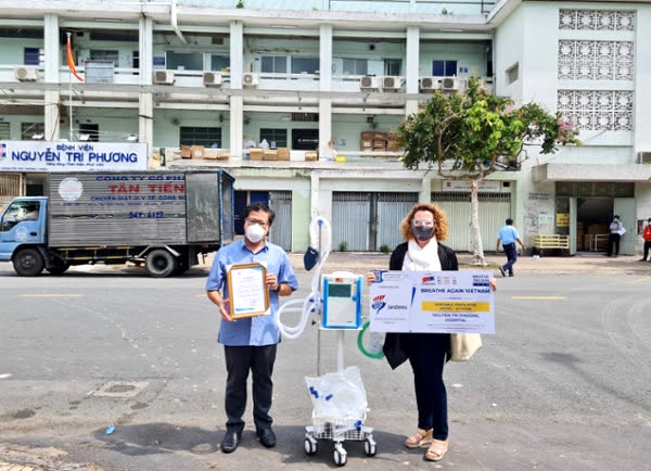 | Đại diện các DN châu Âu trao máy thở hỗ trợ Bệnh viện Nguyễn Tri Phương ở TPHCM. |