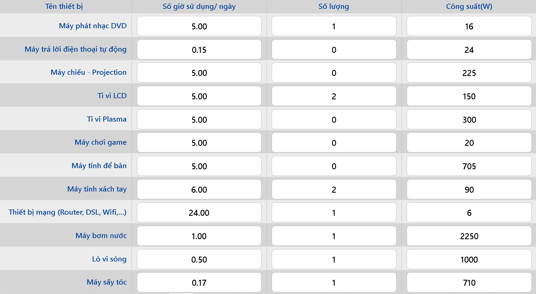 | Ước tính sản lượng điện tiêu thụ của một số thiết bị gia đình |