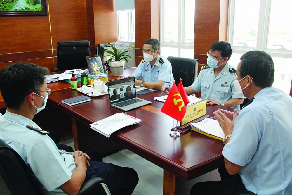 | Lãnh đạo Cục Hải quan Bình Dương và các phòng ban tham mưu thực hiện tham vấn trực tuyến gỡ vướng về thủ tục hải quan cho Công ty TNHH Medochemie (Viễn Đông). Ảnh: Phi Vũ |