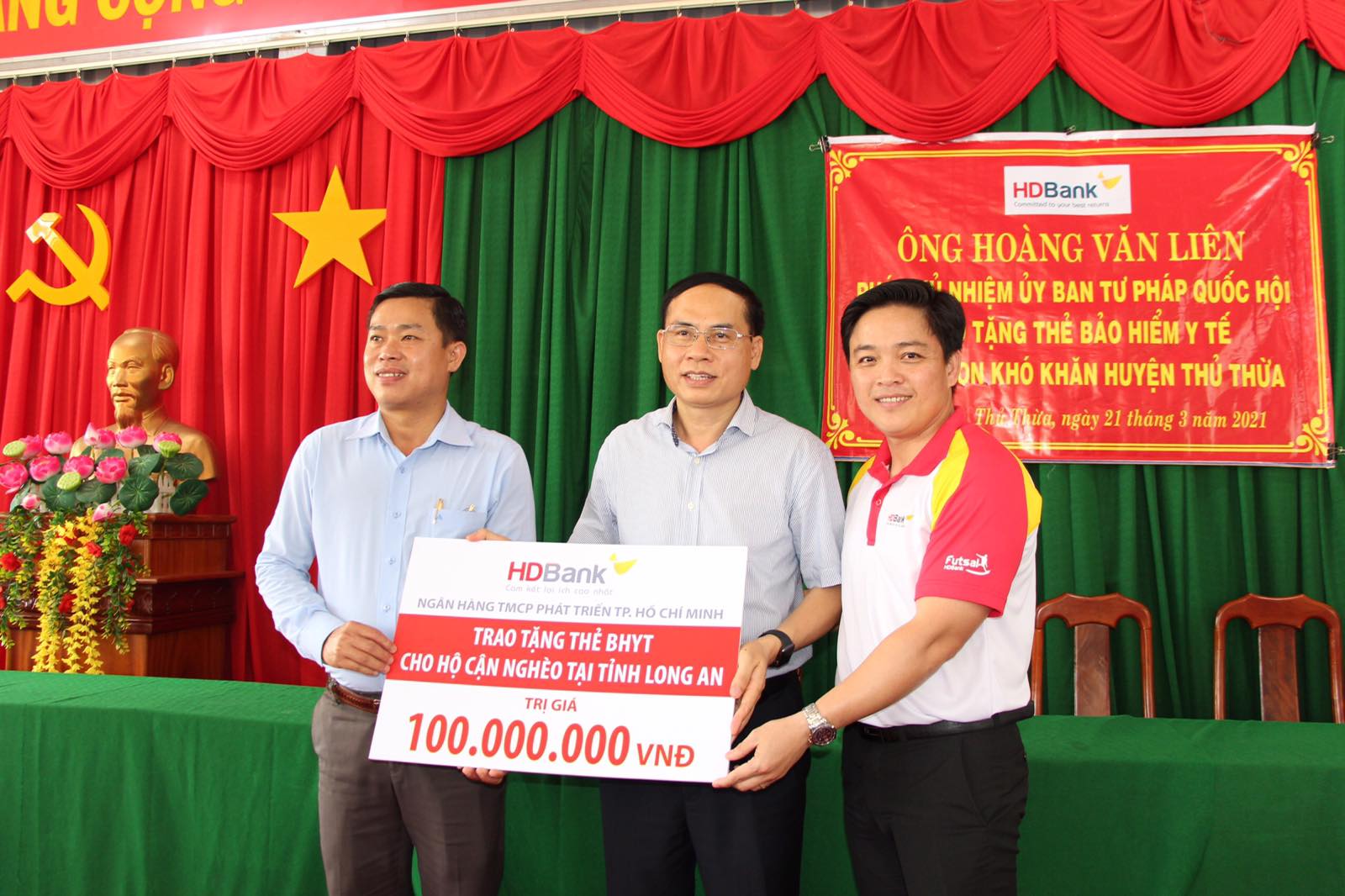 (Chinhphu.vn) - Tiếp tục hành trình thiện nguyện “Chắp cánh yêu thương”, ngày 21/3/2021, HDBank đã trao tặng trên 120 thẻ bảo hiểm y tế (BHYT) trị giá 100 triệu đồng cho các hộ gia đình cận nghèo huyện Thủ Thừa, tỉnh Long An.