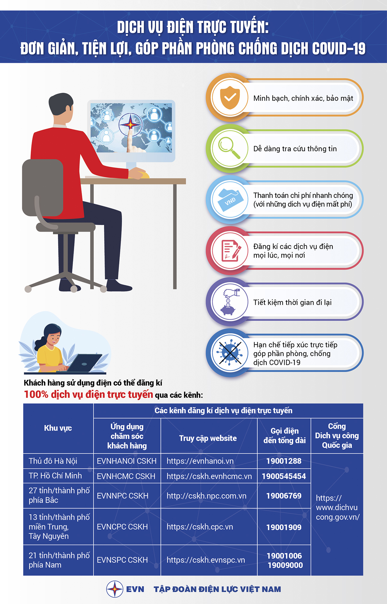 Để bảo đảm khả năng phục vụ 24/7 đối với các khách hàng sử dụng điện, hiện nay, các trung tâm chăm sóc khách hàng và các đơn vị điện lực của EVN đều đã triển khai các giải pháp thích ứng, phòng chống dịch và làm việc phù hợp với tình hình diễn biến của dịch COVID-19.