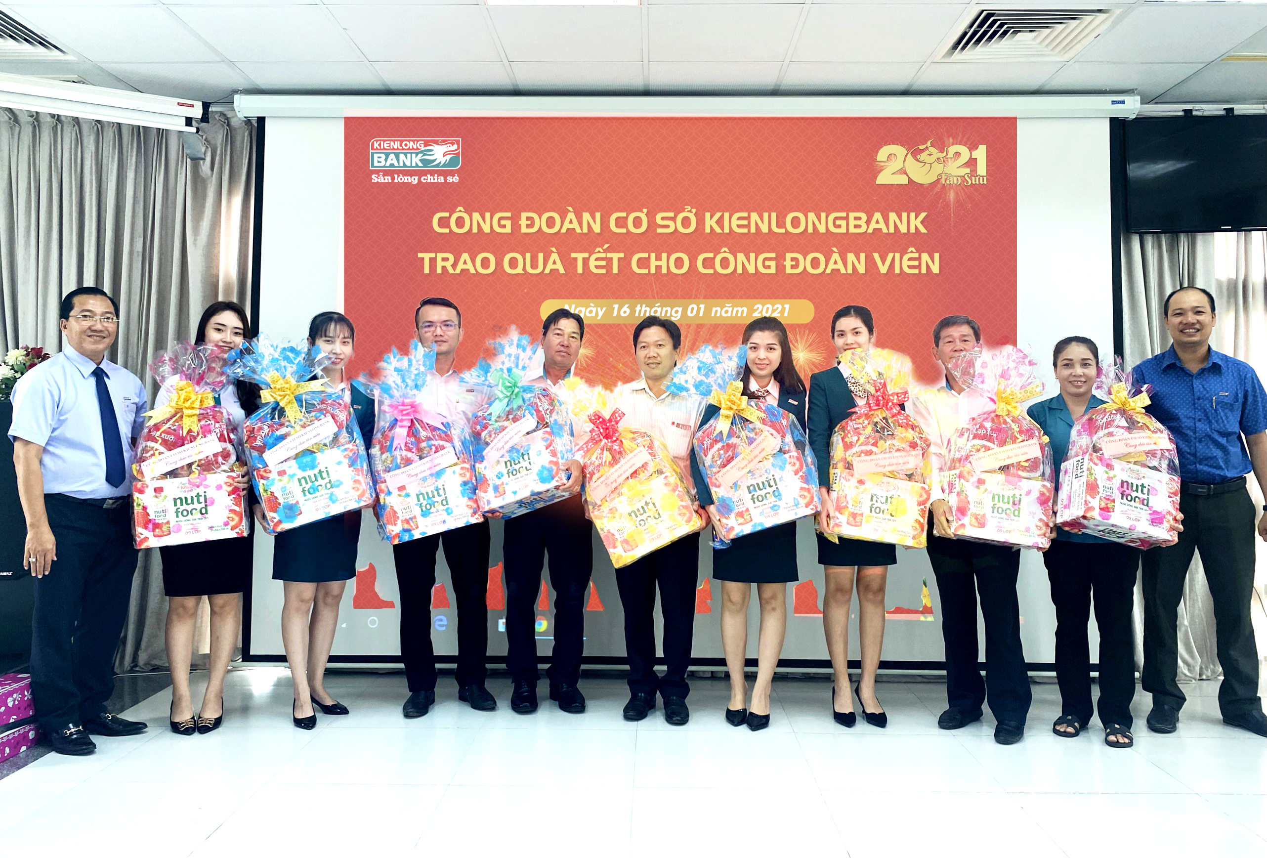 Cụ thể, CĐCS Kienlongbank trao tặng 3.080 phần quà Tết cho công đoàn viên (giá trị mỗi phần 400.000 đồng); hỗ trợ một phần chi phí vé xe, tàu, máy bay cho công đoàn viên về quê đón Tết (với mức hỗ trợ cao nhất lên đến 800.000đồng/suất tùy theo lộ trình); trợ cấp cho công đoàn viên và người lao động có hoàn cảnh khó khăn (1 triệu đồng/người). Tổng kinh phí thực hiện ước tính khoảng 1,6 tỷ đồng.