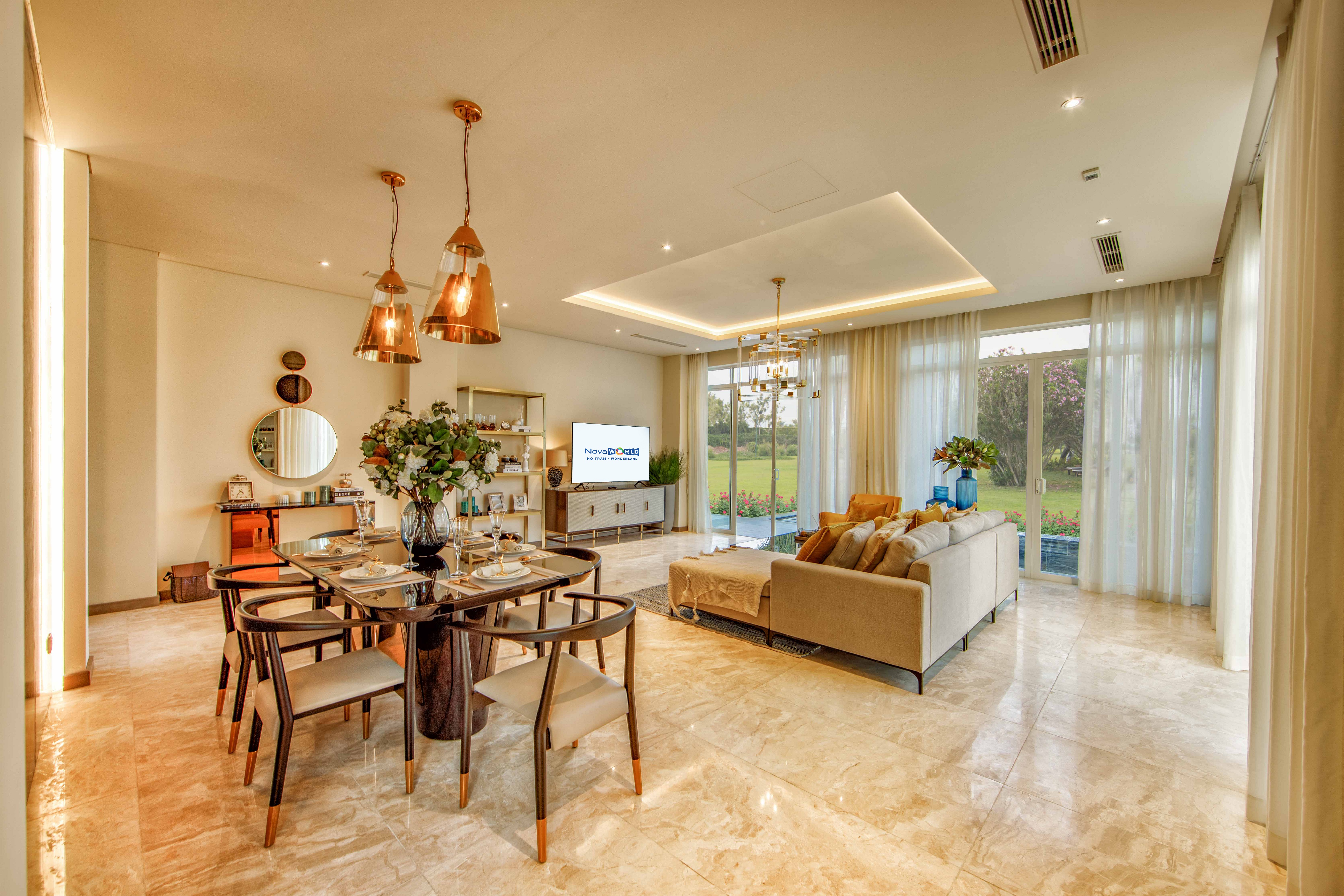 Bên trong mỗi căn biệt thự tứ lập Wonderland bố trí các không gian chức năng vừa mang đến sự thoải mái cho gia chủ, vừa phù hợp cho không gian nghỉ dưỡng đẳng cấp. Phòng khách và phòng ăn hạn chế vách ngăn với gam màu trắng chủ đạo cùng các cửa kính rộng, giúp kết nối với không gian tự nhiên bên ngoài.