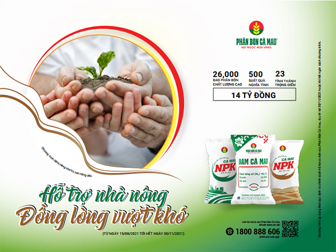Cụ thể, chương trình “Hỗ trợ nhà nông – Đồng lòng vượt khó” sẽ trao tặng tới bà con nông dân đang gặp khó khăn trên toàn quốc với hơn 26.000 bao phân bón chất lượng cao mang thương hiệu Phân Bón Cà Mau. Như vậy, mỗi nông dân được Phân bón Cà Mau hỗ trợ lần này sẽ nhận được 100kg phân bón (NPK Cà Mau hoặc Ure Cà Mau) tương đương 900.000 đồng/người. Cùng với hỗ trợ phân bón tái sản xuất, bà con tại các tỉnh ĐBSCL sẽ nhận được 500 phần quà là các nhu yếu phẩm thiết yếu như: gạo, đường, dầu ăn, trang thiết bị y tế... giúp bà con vơi bớt phần nào khó khăn vì dịch bệnh.