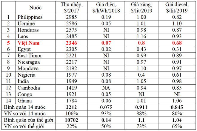 Do đó, có thể thấy, lập luận dùng GDP bình quân đầu người để so sánh và cho rằng giá điện nói riêng và xăng, dầu diesel của các nước (kể cả các nước không có nguồn tài nguyên than đá, dầu mỏ, khí đốt như ta) đem ra so sánh đều cao hơn ta cần có những lý lẽ thuyết phục hơn. Tuy nhiên, mức cao hơn của họ so với mức tăng năm nay của ta cũng chỉ tính theo phần trăm (%) mà thôi (xem B.2 – nguồn: Báo Thanh Niên). Trong khi NSLĐ của phần lớn các nước so sánh với ta trong B.2, theo con số của GS. Nguyễn Thiện Nhân, lại cao hơn ta tính theo lần.