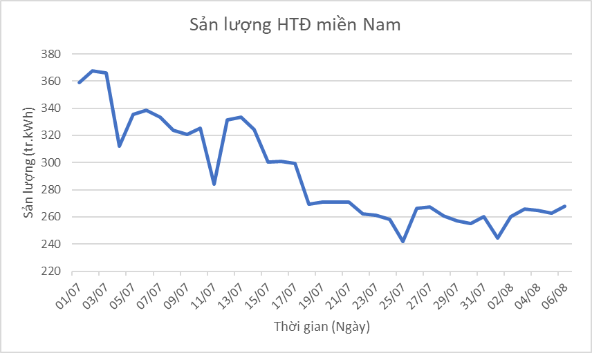 Về sản lượng tiêu thụ điện trong ngày, vào những ngày đầu tháng 7, sản lượng tiêu thụ điện trung bình trong ngày là 326,8 triệu kWh (ngày cực đại đạt 367,3 triệu kWh), thì sản lượng tiêu thụ trung bình ngày sau ngày 19/7 chỉ đạt 263,2 triệu kWh, giảm khoảng 20%.