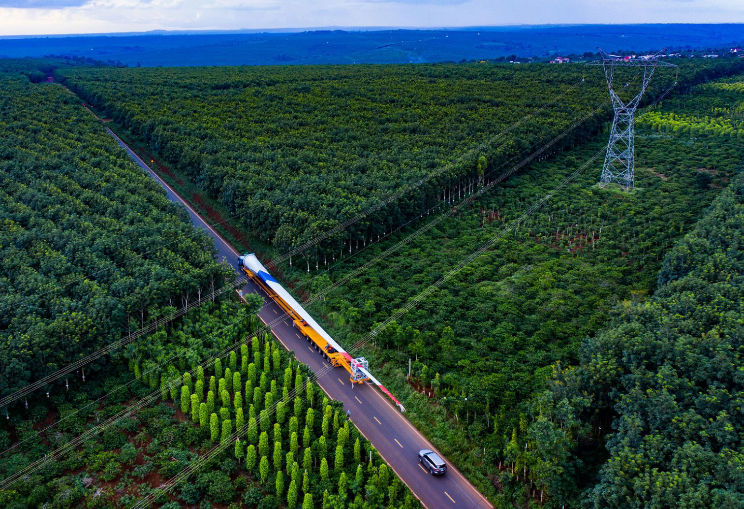 | Đoàn xe chở cánh 69 m trên đường tránh Buôn Hồ, tỉnh Đắk Lắk. |