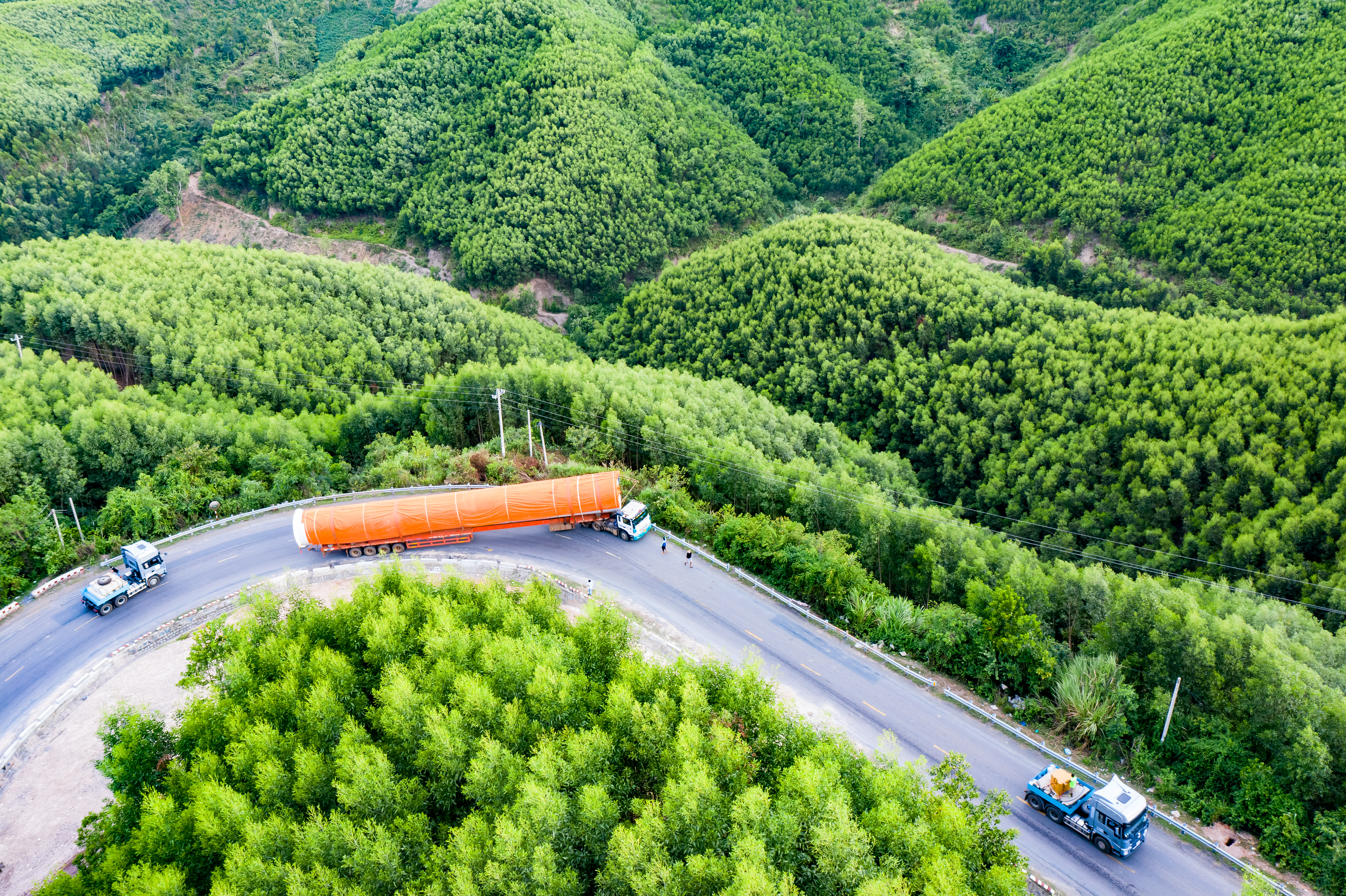 | Các thiết bị được vận chuyển gần 250 km đường bộ từ cảng Nam Vân Phong về dự án bởi xe siêu trường siêu trọng. |