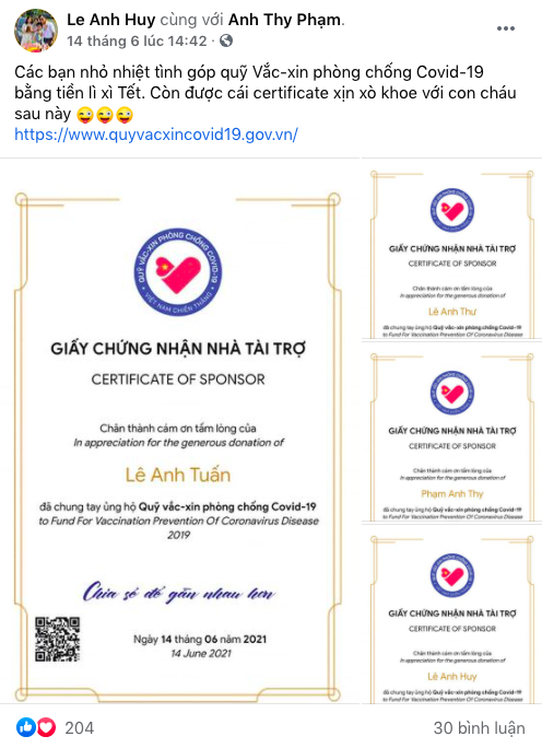 Bằng chứng là, trên mạng xã hội, chúng ta có thể dễ dàng nhìn thấy những hình ảnh về giấy chứng nhận quyên góp thành công được người dân chia sẻ rộng rãi. Nhiều bậc phụ huynh còn hướng dẫn con em mình trực tiếp ủng hộ vào Quỹ vaccine của Chính phủ khi các bé có nguyện vọng và chia sẻ giấy chứng nhận đến với bạn bè, người thân. Bằng hành động này, các em có thể cùng tham gia và lan tỏa tinh thần “đồng lòng chống dịch” cùng những thông điệp tích cực đến xã hội và cộng đồng.