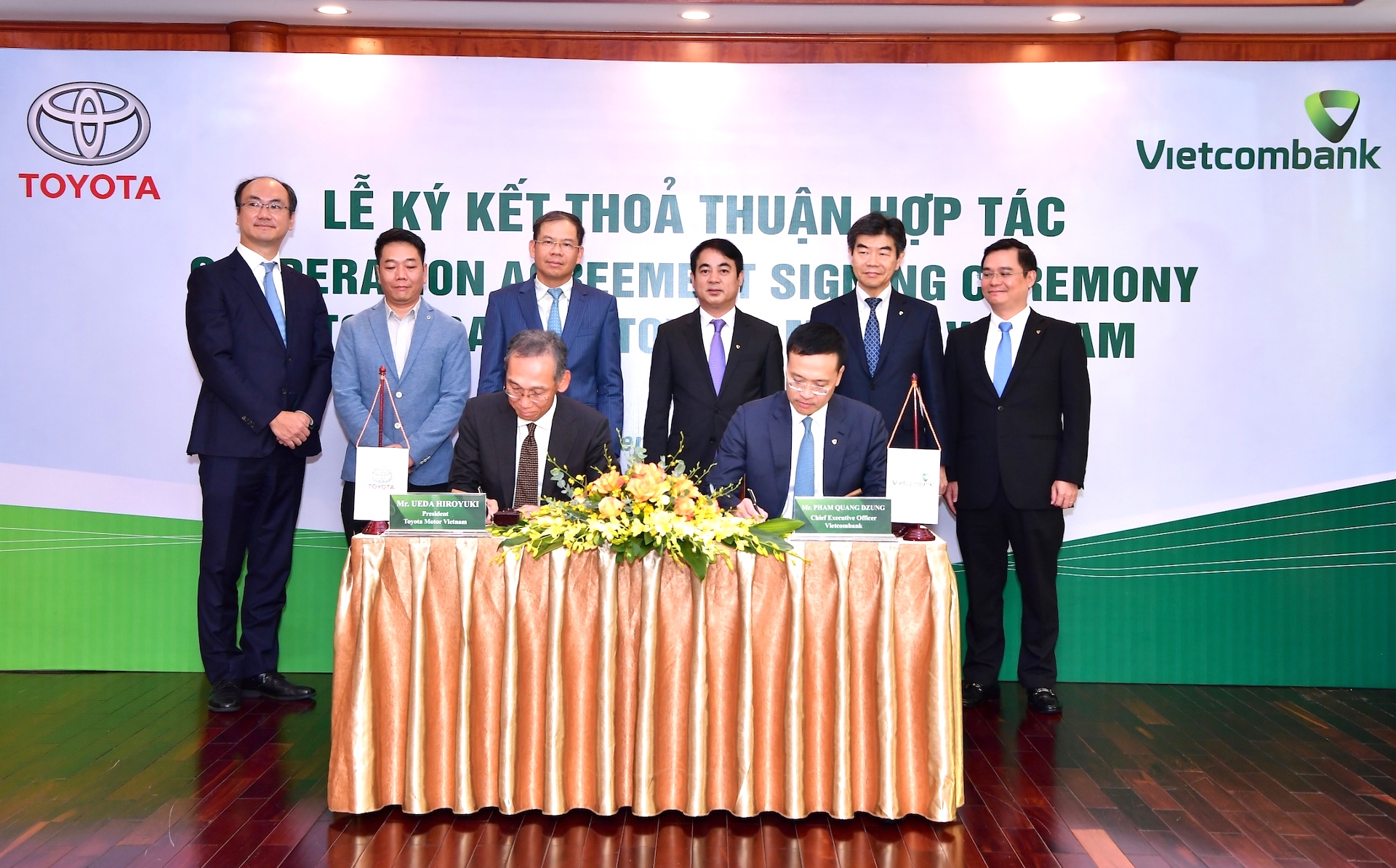 | Ông Hiroyuki Ueda – Tổng Giám đốc Toyota VN (ngồi bên trái) và ông Phạm Quang Dũng – Tổng Giám đốc Vietcombank (ngồi bên phải) ký kết thỏa thuận hợp tác giữa Vietcombank và Toyota VN. |